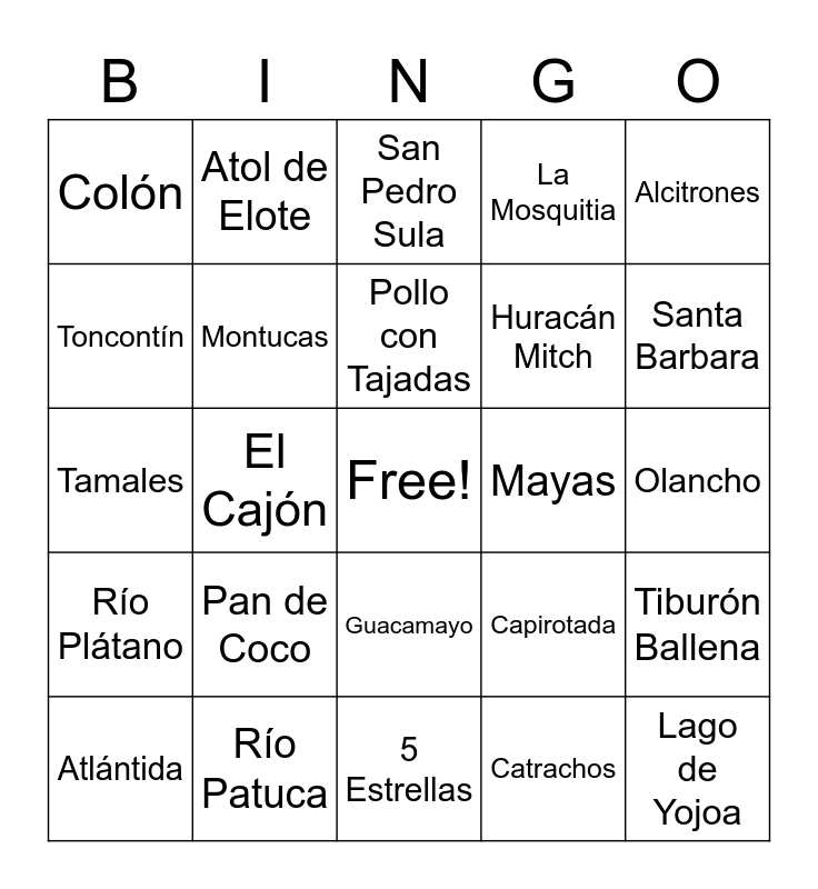 This bingo card has a free space and 75 words: Virgen de Suyapa, Tegucigalpa, San Pedro Sula, La Ceiba, Roatán, Orquídea, Ruinas de Copán, Lempira, Punta, Sopa de Caracol, Garífuna, Baleada, Pollo con Tajadas, Toncontín, Pinol, El Cajón, Lancetilla, Lago de Yojoa, Comayagua, Alcitrones, Casamiento, Tamales, Montucas, Atol de Elote, La Mosquitia, Café Oro, Marimba, La Esperanza, Islas de la Bahía, Trujillo, Centro América, Cerro el Picacho, Danzas Folclóricas, Capirotada, Santa Barbara, Huracán Mitch, Pupusas, Yuca con Chicarrón, Olancho, Catrachos, Cipotes, Cuevas de Taulabé, Guanaja, Utila, Calle Comercio, Puerto Cortés, Atlántida, Colón, Comayagua, Choluteca, El Paraíso, Guacamayo, Gracias a Dios, Intibucá, La Paz, Ocotepeque, Valle de los Ángeles, Pulhapanzak, Semitas, Chiquita Banana, Pan de Coco, Pastelitos, Tostones, Chimol, Sopa de Mondongo, Mayas, 15 de septiembre, Omoa, Tropical, Tiburón Ballena, Río Plátano, Río Patuca, Río Ulua, 5 Estrellas and Escudo.