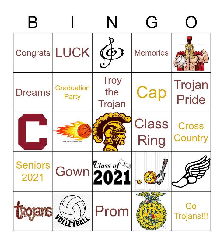 This bingo card has 14 images, a free space and 25 words: Celebrate, Graduation Party, Troy the Trojan, I'm Done, Seniors 2021, Memories, Go Trojans!!!, Cross Country, Class Ring, Gown, CHS, Congrats, Accomplish, Dreams, Prom, Cap, Trojan Pride, Believe, Corona Virus, La Chancla, Friendship, PEP RALLY, LUCK, Success and Diploma.