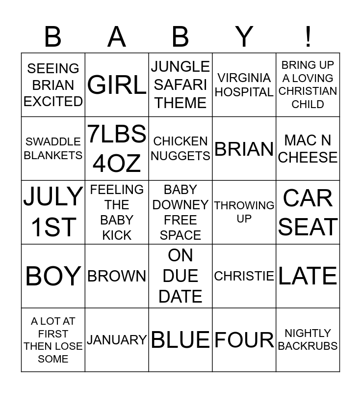 This bingo card has a free space and 24 words: BROWN, JANUARY, CHICKEN NUGGETS, A LOT AT FIRST THEN LOSE SOME, BRING UP A LOVING CHRISTIAN CHILD, SEEING BRIAN EXCITED, SWADDLE BLANKETS, GIRL, THROWING UP, ON DUE DATE, BRIAN, JULY 1ST, CHRISTIE, LATE, 7LBS 4OZ, FOUR, CAR SEAT, JUNGLE SAFARI THEME, MAC N CHEESE, FEELING THE BABY KICK, NIGHTLY BACKRUBS, BOY, VIRGINIA HOSPITAL and BLUE.