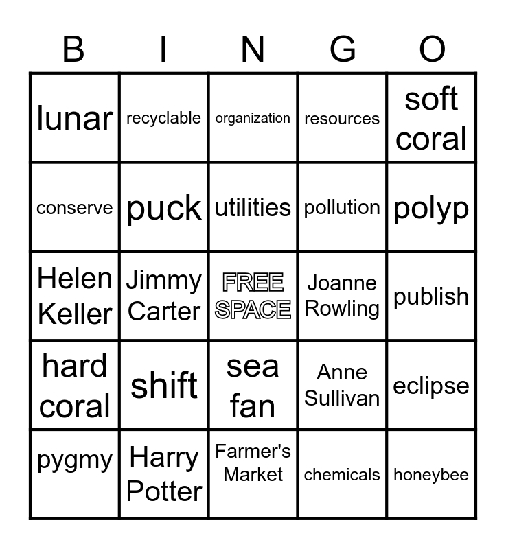 This bingo card has a free space and 29 words: pygmy, plankton, Jimmy Carter, influence, lunar, organization, puck, shift, Joanne Rowling, Harry Potter, publish, honeybee, Farmer's Market, chemicals, polyp, algae, sea fan, hard coral, soft coral, Helen Keller, Anne Sullivan, activist, pollution, conserve, resources, recyclable, eclipse, utilities and solar.