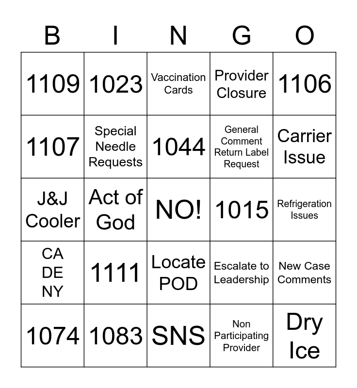 This bingo card has a free space and 24 words: 1111, 1083, 1044, 1074, 1106, 1109, 1107, 1023, 1015, Locate POD, General Comment Return Label Request, J&J Cooler, Escalate to Leadership, New Case Comments, Special Needle Requests, Non Participating Provider, Refrigeration Issues, Vaccination Cards, Carrier Issue, Act of God, Dry Ice, CA DE NY, Provider Closure and SNS.