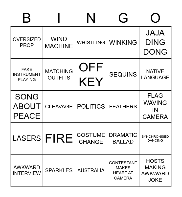 This bingo card has a free space and 24 words: FIRE, SPARKLES, OFF KEY, AWKWARD INTERVIEW, JAJA DING DONG, OVERSIZED PROP, FAKE INSTRUMENT PLAYING, WIND MACHINE, FEATHERS, COSTUME CHANGE, SEQUINS, SONG ABOUT PEACE, DRAMATIC BALLAD, SYNCHRONISED DANCING, MATCHING OUTFITS, CONTESTANT MAKES HEART AT CAMERA, FLAG WAVING IN CAMERA, WHISTLING, NATIVE LANGUAGE, CLEAVAGE, HOSTS MAKING AWKWARD JOKE, LASERS, WINKING and AUSTRALIA.