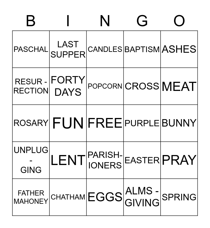 This bingo card has a free space and 24 words: LENT, CHATHAM, POPCORN, FATHER MAHONEY, ASHES, PASCHAL, RESUR - RECTION, LAST SUPPER, PURPLE, PARISH- IONERS, CROSS, ROSARY, EASTER, PRAY, FORTY DAYS, ALMS - GIVING, BUNNY, CANDLES, MEAT, FUN, SPRING, UNPLUG - GING, BAPTISM and EGGS.
