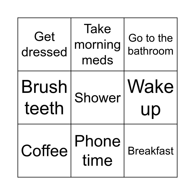 This bingo card has a free space and 8 words: Wake up, Go to the bathroom, Take morning meds, Coffee, Get dressed, Breakfast, Brush teeth and Phone time.