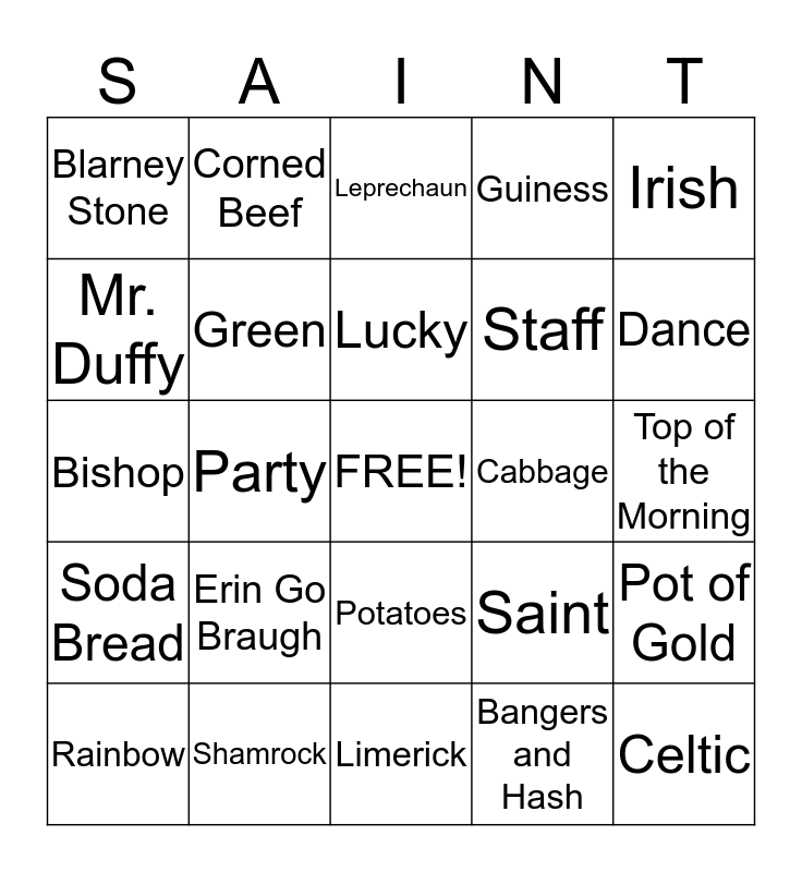 This bingo card has a free space and 24 words: Erin Go Braugh, Shamrock, Lucky, Rainbow, Irish, Blarney Stone, Mr. Duffy, Corned Beef, Cabbage, Potatoes, Staff, Bishop, Saint, Pot of Gold, Green, Bangers and Hash, Top of the Morning, Leprechaun, Dance, Party, Celtic, Soda Bread, Guiness and Limerick.