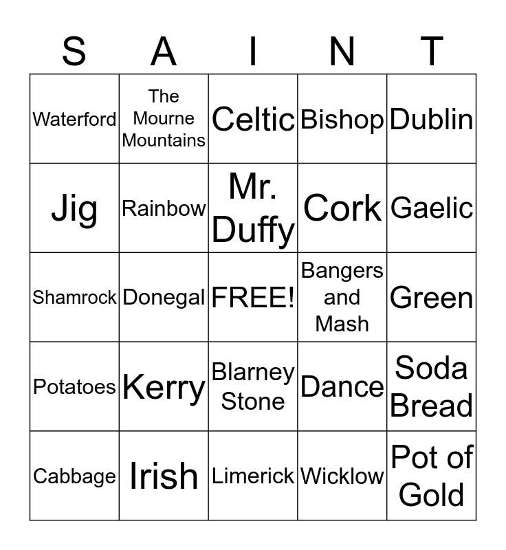 This bingo card has a free space and 41 words: Erin Go Braugh, Shamrock, Lucky, Rainbow, Irish, Blarney Stone, Mr. Duffy, Corned Beef, Dublin, Potatoes, Donegal, Bishop, Pot of Gold, Green, Bangers and Mash, Kerry, Leprechaun, Waterford, Party, Celtic, Soda Bread, Guiness, Limerick, Cork, Reel, Galway, Wicklow, Ireland, Gaelic, Emerald, Down, The Mourne Mountains, Cabbage, Shepherds Pie, Dance, Jig, St. Brigid, St. Patrick, Pub, Riverdance and Castles.