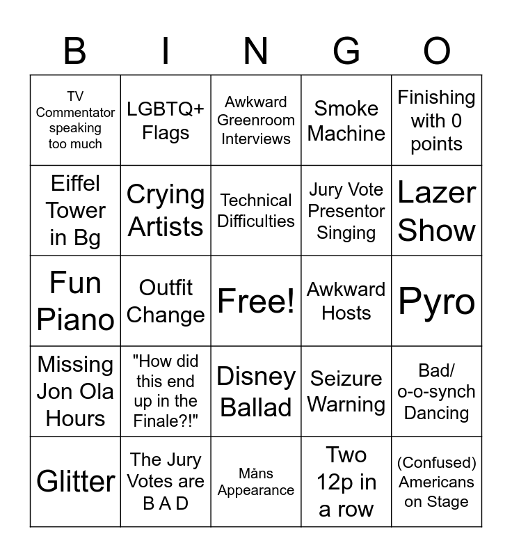 This bingo card has a free space and 24 words: "How did this end up in the Finale?!", The Jury Votes are B A D, Technical Difficulties, Glitter, Finishing with 0 points, TV Commentator speaking too much, Eiffel Tower in Bg, LGBTQ+ Flags, Awkward Hosts, Disney Ballad, Jury Vote Presentor Singing, Fun Piano, Seizure Warning, Bad/ o-o-synch Dancing, Crying Artists, Two 12p in a row, Pyro, Awkward Greenroom Interviews, Lazer Show, Outfit Change, (Confused) Americans on Stage, Missing Jon Ola Hours, Smoke Machine and Måns Appearance.