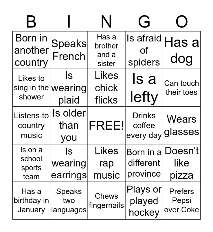 This bingo card has a free space and 24 words: Is wearing earrings, Speaks two languages, Likes chick flicks, Has a birthday in January, Has a dog, Born in another country, Likes to sing in the shower, Speaks French, Drinks coffee every day, Likes rap music, Is a lefty, Listens to country music, Born in a different province, Doesn't like pizza, Is wearing plaid, Plays or played hockey, Wears glasses, Has a brother and a sister, Can touch their toes, Is older than you, Prefers Pepsi over Coke, Is on a school sports team, Is afraid of spiders and Chews fingernails.