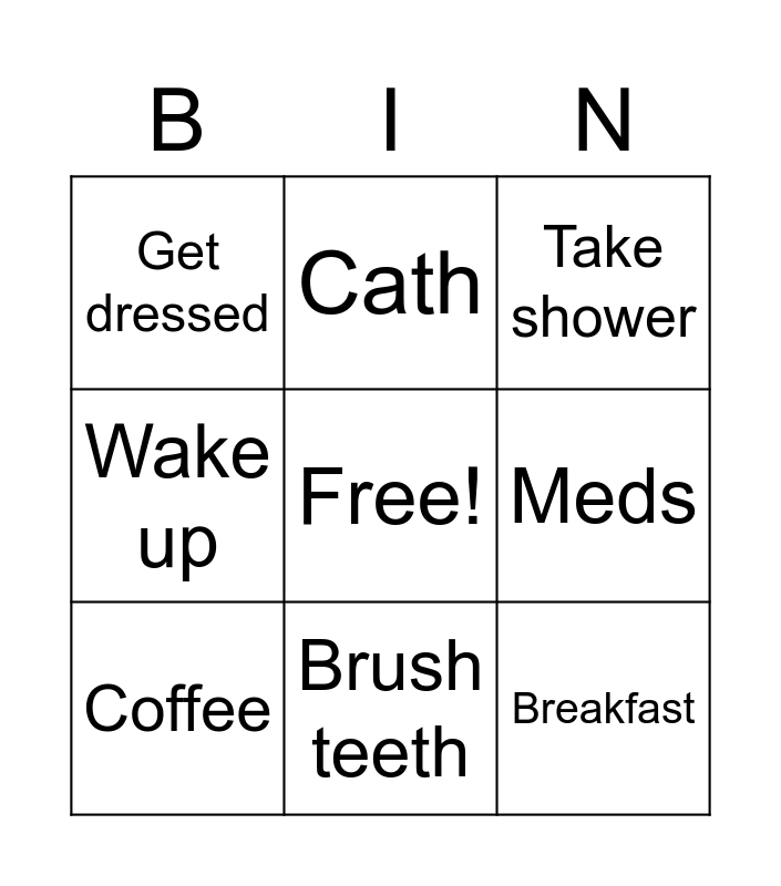 This bingo card has a free space and 8 words: Wake up, Cath, Meds, Coffee, Take shower, Get dressed, Brush teeth and Breakfast.
