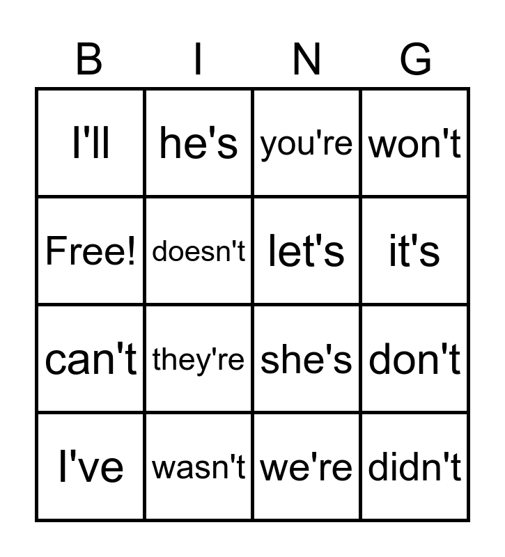 This bingo card has 16 words: wasn't, don't, you're, I'll, can't, he's, she's, we're, Free!, doesn't, I've, won't, they're, it's, let's and didn't.