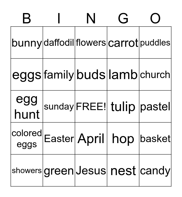 This bingo card has a free space and 24 words: Easter, green, buds, showers, puddles, bunny, eggs, daffodil, tulip, April, lamb, egg hunt, hop, basket, family, nest, pastel, flowers, church, sunday, candy, colored eggs, carrot and Jesus.