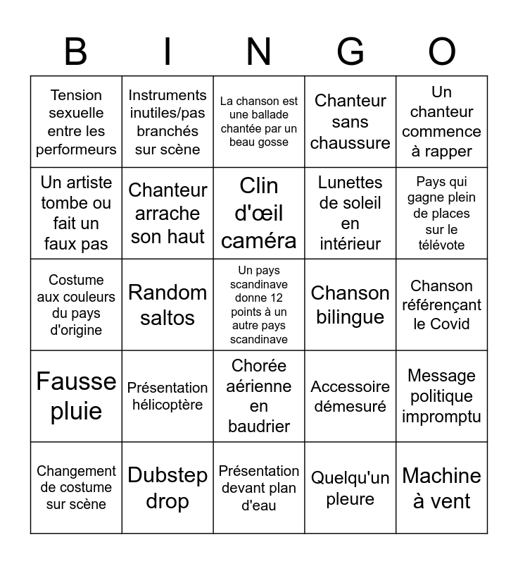 This bingo card has 25 words: Présentation hélicoptère, Présentation devant plan d'eau, Clin d'œil caméra, Changement de costume sur scène, Un chanteur commence à rapper, Tension sexuelle entre les performeurs, Un artiste tombe ou fait un faux pas, Instruments inutiles/pas branchés sur scène, Chanson bilingue, Chorée aérienne en baudrier, Lunettes de soleil en intérieur, Costume aux couleurs du pays d'origine, Accessoire démesuré, Message politique impromptu, Chanteur arrache son haut, Machine à vent, Chanson référençant le Covid, La chanson est une ballade chantée par un beau gosse, Pays qui gagne plein de places sur le télévote, Random saltos, Un pays scandinave donne 12 points à un autre pays scandinave, Dubstep drop, Fausse pluie, Chanteur sans chaussure and Quelqu'un pleure.