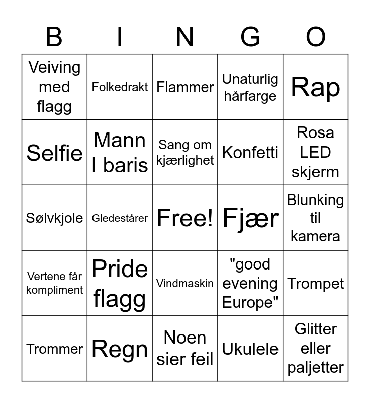 This bingo card has a free space and 24 words: Pride flagg, Regn, Sang om kjærlighet, Trommer, Rap, Veiving med flagg, Selfie, Folkedrakt, Fjær, Vindmaskin, Konfetti, Sølvkjole, "good evening Europe", Trompet, Mann I baris, Ukulele, Blunking til kamera, Flammer, Rosa LED skjerm, Gledestårer, Glitter eller paljetter, Vertene får kompliment, Unaturlig hårfarge and Noen sier feil.