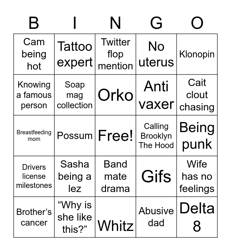 This bingo card has a free space and 25 words: Sasha being a lez, Whitz, Orko, Brother’s cancer, Klonopin, Cam being hot, Knowing a famous person, Tattoo expert, Calling Brooklyn The Hood, Band mate drama, Anti vaxer, Breastfeeding mom, Gifs, Wife has no feelings, Soap mag collection, Drug busters photo, Being punk, Twitter flop mention, Cait clout chasing, Possum, Delta 8, “Why is she like this?”, Drivers license milestones, No uterus and Abusive dad.