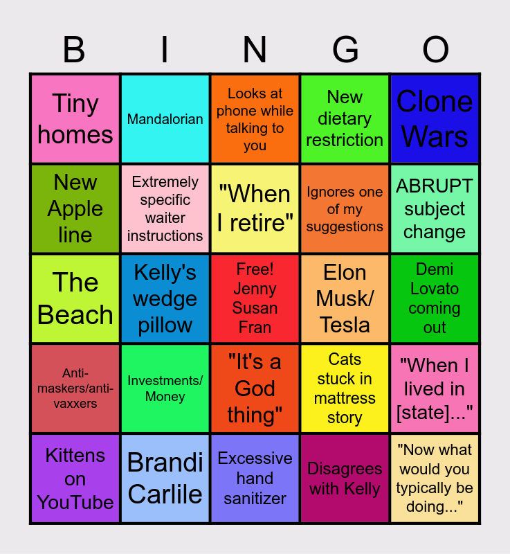 This bingo card has a free space and 24 words: Investments/ Money, Brandi Carlile, "When I retire", Kittens on YouTube, Clone Wars, Tiny homes, New Apple line, Mandalorian, Elon Musk/ Tesla, "It's a God thing", Ignores one of my suggestions, The Beach, Cats stuck in mattress story, "When I lived in [state]...", Extremely specific waiter instructions, Disagrees with Kelly, Demi Lovato coming out, Looks at phone while talking to you, ABRUPT subject change, Kelly's wedge pillow, "Now what would you typically be doing...", Anti-maskers/anti-vaxxers, New dietary restriction and Excessive hand sanitizer.
