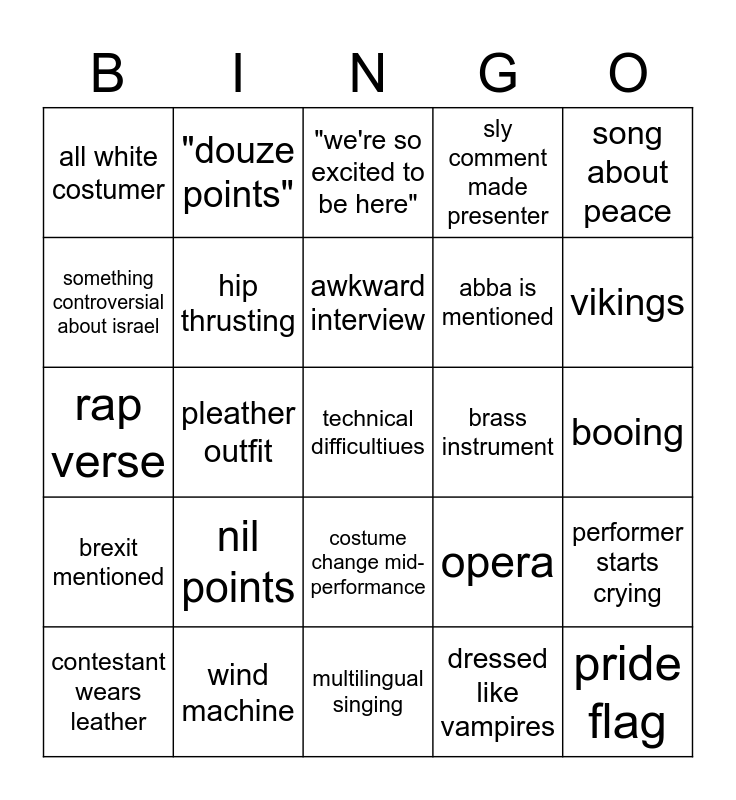 This bingo card has a free space and 24 words: nil points, wind machine, awkward interview, contestant wears leather, song about peace, all white costumer, something controversial about israel, "douze points", brass instrument, costume change mid-performance, abba is mentioned, rap verse, opera, performer starts crying, hip thrusting, dressed like vampires, booing, "we're so excited to be here", vikings, pleather outfit, pride flag, brexit mentioned, sly comment made presenter and multilingual singing.