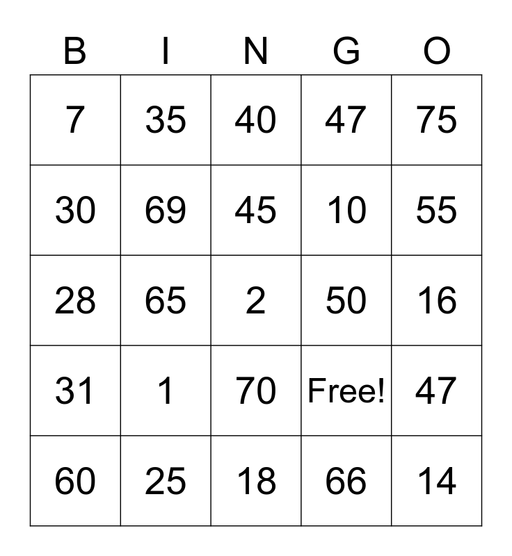 This bingo card has 25 words: 1, 18, 45, 60, 75, 7, 30, 35, 50, 70, 10, 28, Free!, 47, 69, 14, 16, 40, 55, 65, 2, 25, 31, 47 and 66.