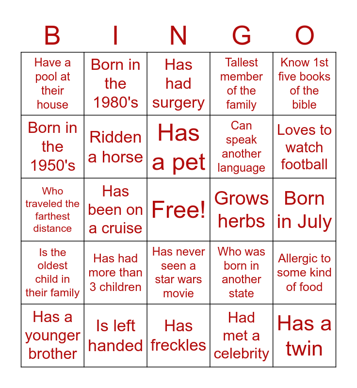 This bingo card has a free space and 29 words: Has a younger brother, Has had stitches before, Has been on a cruise, Appeared on TV, Have a pool at their house, Has had surgery, Ridden a horse, Has had more than 3 children, Grows herbs, Is left handed, Born in July, Has a twin, Has freckles, Had met a celebrity, Loves to watch football, Has more than 4 siblings, Has never seen a star wars movie, Is the oldest child in their family, Know 1st five books of the bible, Who traveled the farthest distance, Who was born in another state, Plays a musical instrument, Can speak another language, Born in the 1950's, Tallest member of the family, Born in the 1980's, Allergic to some kind of food, Has a pet and Serve/served in Law enforcement or Military.