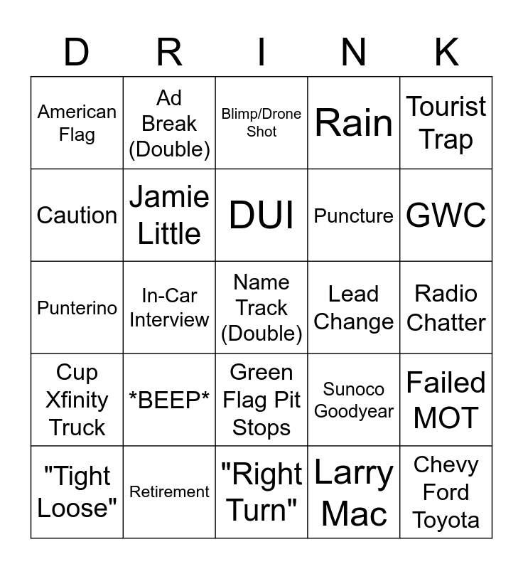 This bingo card has a free space and 24 words: *BEEP*, Retirement, DUI, "Tight Loose", Tourist Trap, American Flag, Caution, Ad Break (Double), Lead Change, Green Flag Pit Stops, Puncture, Punterino, Sunoco Goodyear, Failed MOT, Jamie Little, Larry Mac, Radio Chatter, Blimp/Drone Shot, GWC, In-Car Interview, Chevy Ford Toyota, Cup Xfinity Truck, Rain and "Right Turn".