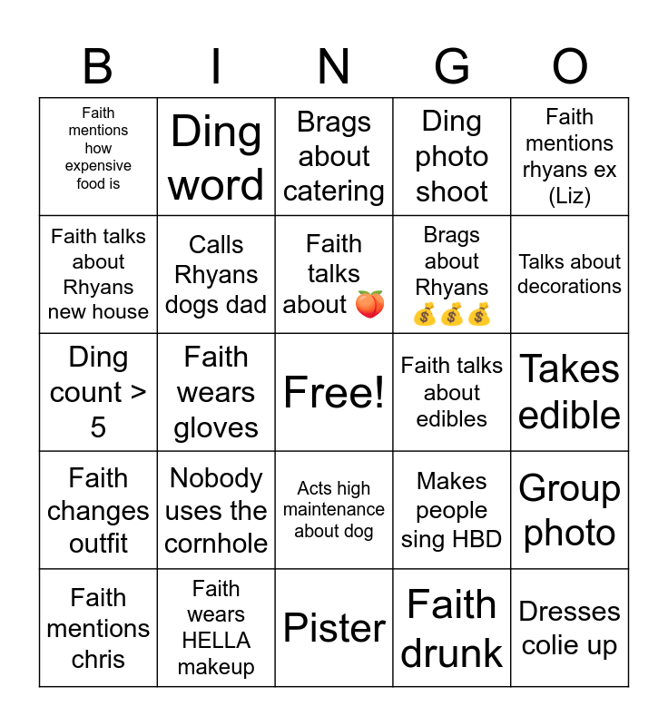This bingo card has a free space and 24 words: Nobody uses the cornhole, Faith wears HELLA makeup, Faith talks about 🍑, Faith mentions chris, Faith mentions rhyans ex (Liz), Faith mentions how expensive food is, Faith talks about Rhyans new house, Ding word, Faith talks about edibles, Acts high maintenance about dog, Brags about Rhyans 💰💰💰, Ding count > 5, Makes people sing HBD, Group photo, Calls Rhyans dogs dad, Faith drunk, Takes edible, Brags about catering, Talks about decorations, Faith wears gloves, Dresses colie up, Faith changes outfit, Ding photo shoot and Pister.