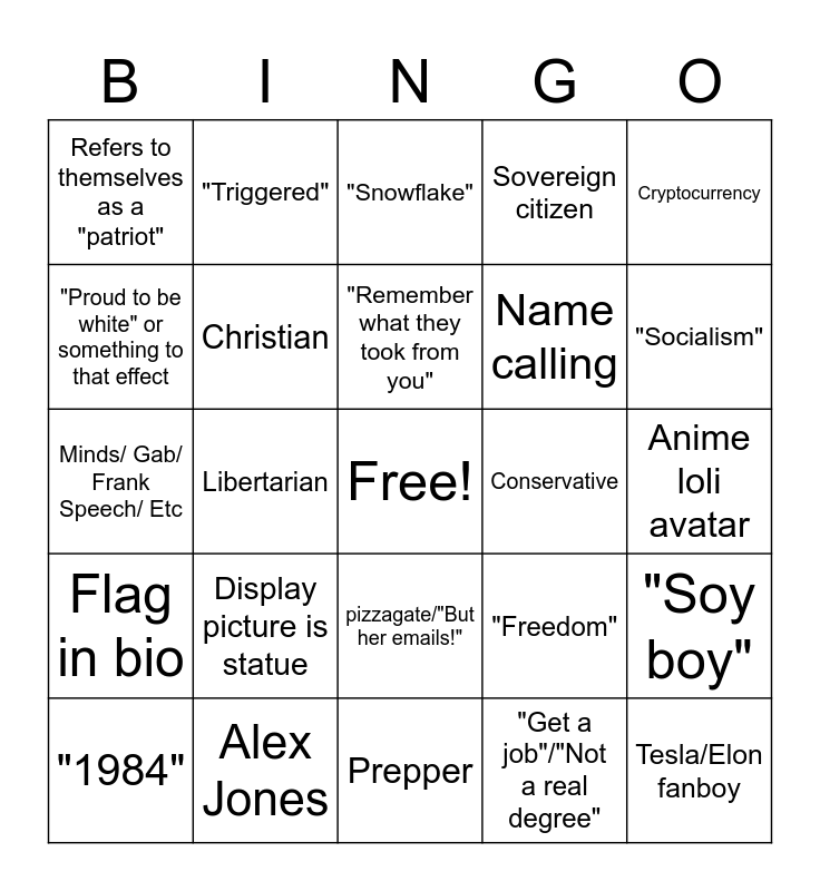 This bingo card has a free space and 24 words: Display picture is statue, Alex Jones, "Remember what they took from you", "1984", Cryptocurrency, Refers to themselves as a "patriot", "Proud to be white" or something to that effect, "Triggered", Conservative, pizzagate/"But her emails!", Name calling, Minds/ Gab/ Frank Speech/ Etc, "Freedom", "Soy boy", Christian, "Get a job"/"Not a real degree", Anime loli avatar, "Snowflake", "Socialism", Libertarian, Tesla/Elon fanboy, Flag in bio, Sovereign citizen and Prepper.