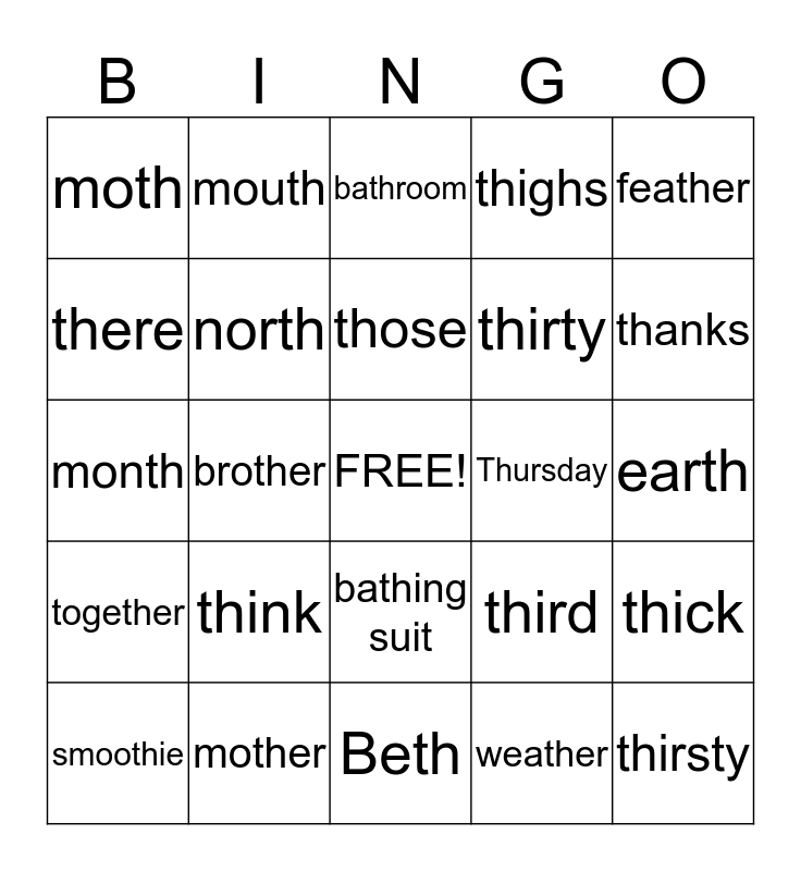 This bingo card has a free space and 24 words: think, mother, those, smoothie, feather, moth, there, mouth, Thursday, bathing suit, thirty, month, third, thick, north, weather, earth, bathroom, thanks, brother, thirsty, together, thighs and Beth.