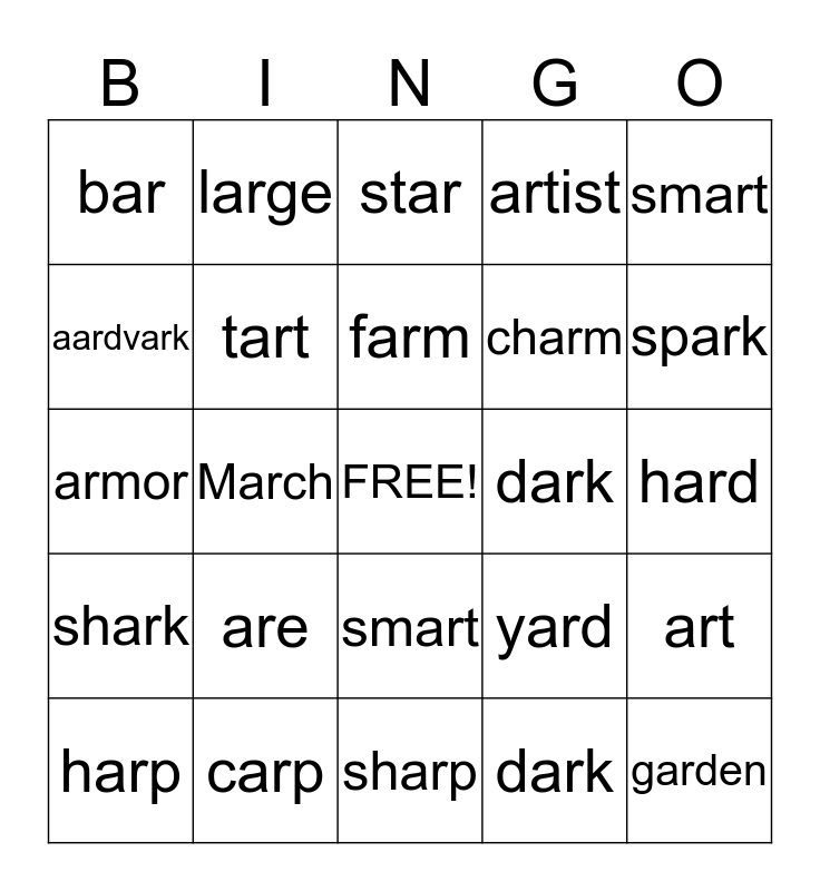 This bingo card has a free space and 24 words: are, carp, farm, harp, smart, bar, aardvark, large, dark, smart, charm, armor, yard, art, tart, dark, hard, star, spark, March, garden, shark, artist and sharp.