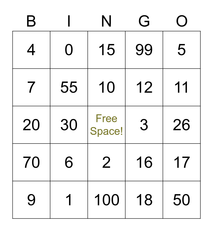 This bingo card has a free space and 24 words: 6, 1, 10, 9, 5, 4, 7, 0, 3, 2, 12, 20, 16, 17, 55, 18, 26, 15, 11, 30, 50, 70, 99 and 100.