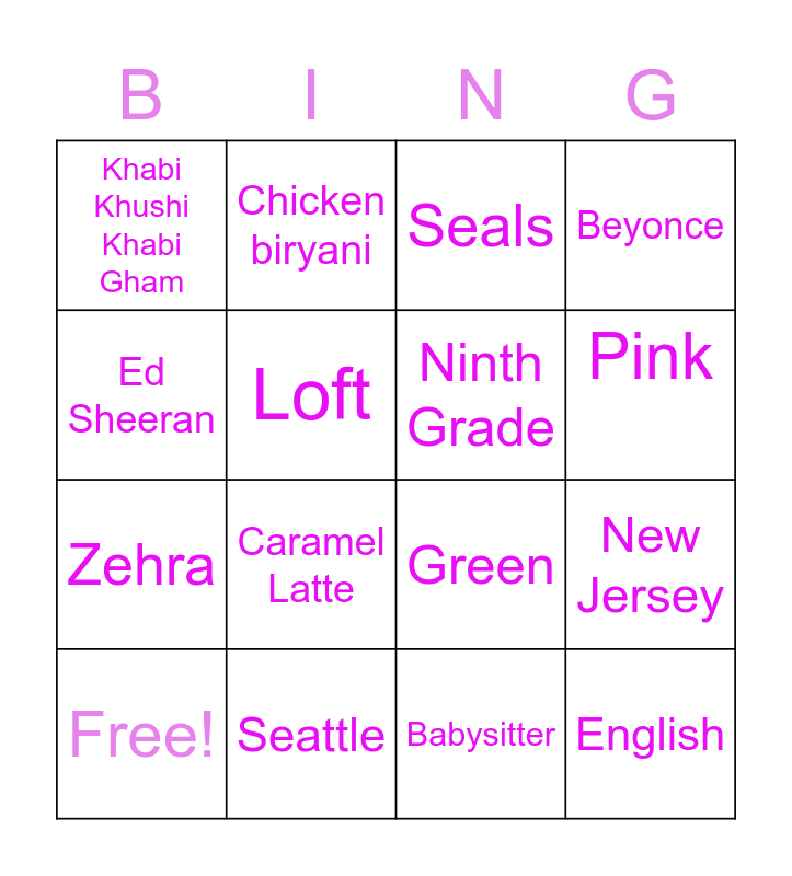 This bingo card has 23 words: English, F.R.I..E.N.D.S, Pink, Camp counselor, Ed Sheeran, Khabi Khushi Khabi Gham, Loft, Chicken biryani, Free!, Buffalo Chicken, Caramel Latte, Zehra, Boston Public Garden, Caring, Seattle, Fourth Grade, Seals, Green, Ninth Grade, New Jersey, Beyonce, Babysitter and Education for Empowerment.