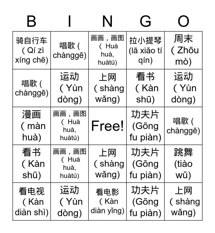 This bingo card has a free space and 72 words: 爱好 (àihào), 唱歌 ( chànggē), 画画,画图( Huà huà, huàtú), 上网 (shàng wǎng), 跳舞 (tiào wǔ), 弹钢琴 (Tàn gāng qín), 拉小提琴 (lā xiǎo tí qín), 听音乐 (Tīng yīn yuè), 看书 (Kàn shū), 看电影 (Kàn diàn yǐng), 看电视 (Kàn diàn shì), 旅游 (Lǚ yóu), 运动 (Yùn dòng), 骑自行车 (Qí zì xíng chē), 故事书 (Gùshì shū), 漫画 (màn huà), 功夫片 (Gōng fu piàn), 周末 (Zhōu mò), 爱好 (àihào), 唱歌 ( chànggē), 画画,画图( Huà huà, huàtú), 上网 (shàng wǎng), 跳舞 (tiào wǔ), 弹钢琴 (Tàn gāng qín), 拉小提琴 (lā xiǎo tí qín), 听音乐 (Tīng yīn yuè), 看书 (Kàn shū), 看电影 (Kàn diàn yǐng), 看电视 (Kàn diàn shì), 旅游 (Lǚ yóu), 运动 (Yùn dòng), 骑自行车 (Qí zì xíng chē), 故事书 (Gùshì shū), 漫画 (màn huà), 功夫片 (Gōng fu piàn), 周末 (Zhōu mò), 迷 (mí), 爱好 (àihào), 唱歌 ( chànggē), 画画,画图( Huà huà, huàtú), 上网 (shàng wǎng), 跳舞 (tiào wǔ), 弹钢琴 (Tàn gāng qín), 拉小提琴 (lā xiǎo tí qín), 听音乐 (Tīng yīn yuè), 看书 (Kàn shū), 看电影 (Kàn diàn yǐng), 看电视 (Kàn diàn shì), 旅游 (Lǚ yóu), 运动 (Yùn dòng), 骑自行车 (Qí zì xíng chē), 故事书 (Gùshì shū), 漫画 (màn huà), 功夫片 (Gōng fu piàn), 爱好 (àihào), 唱歌 ( chànggē), 画画,画图( Huà huà, huàtú), 上网 (shàng wǎng), 跳舞 (tiào wǔ), 弹钢琴 (Tàn gāng qín), 拉小提琴 (lā xiǎo tí qín), 听音乐 (Tīng yīn yuè), 看书 (Kàn shū), 看电影 (Kàn diàn yǐng), 看电视 (Kàn diàn shì), 旅游 (Lǚ yóu), 运动 (Yùn dòng), 骑自行车 (Qí zì xíng chē), 故事书 (Gùshì shū), 漫画 (màn huà), 功夫片 (Gōng fu piàn) and 周末 (Zhōu mò).