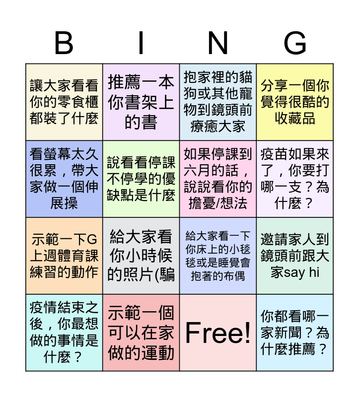 This bingo card has 16 words: 示範一個可以在家做的運動, 邀請家人到鏡頭前跟大家say hi, 抱家裡的貓狗或其他寵物到鏡頭前療癒大家, 讓大家看看你的零食櫃都裝了什麼, 示範一下G上週體育課練習的動作, 推薦一本你書架上的書, 給大家看一下你床上的小毯毯或是睡覺會抱著的布偶, Free!, 看螢幕太久很累,帶大家做一個伸展操, 說看看停課不停學的優缺點是什麼, 疫情結束之後,你最想做的事情是什麼?, 分享一個你覺得很酷的收藏品, 給大家看你小時候的照片(騙, 疫苗如果來了,你要打哪一支?為什麼?, 如果停課到六月的話,說說看你的擔憂/想法 and 你都看哪一家新聞?為什麼推薦?.