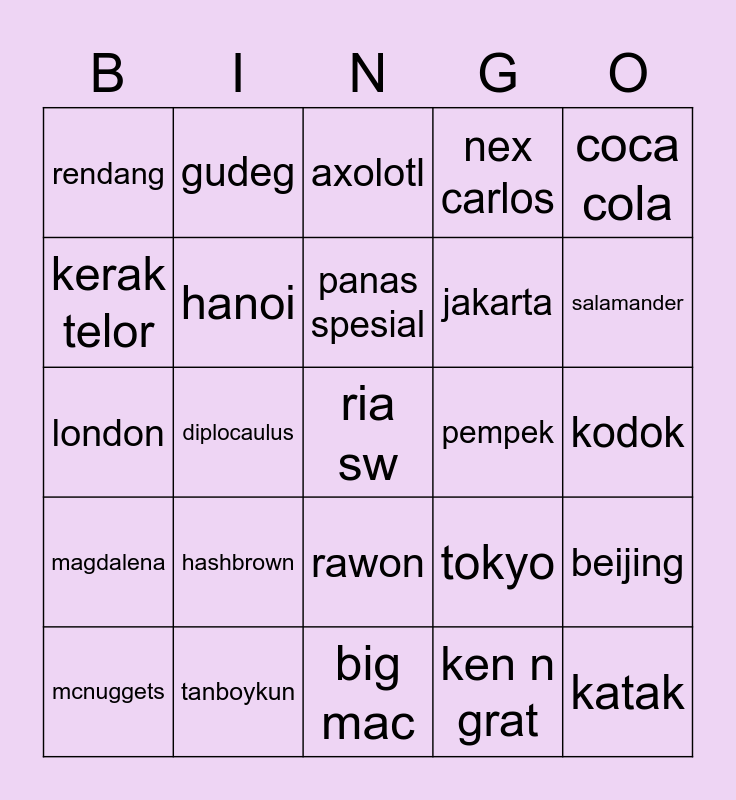 This bingo card has 25 words: hashbrown, big mac, panas spesial, mcnuggets, coca cola, rendang, kerak telor, gudeg, pempek, rawon, jakarta, london, tokyo, beijing, hanoi, katak, kodok, axolotl, salamander, diplocaulus, ria sw, tanboykun, magdalena, nex carlos and ken n grat.