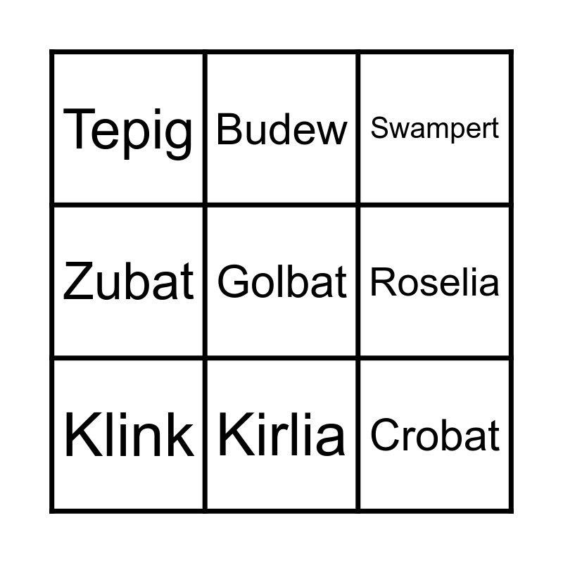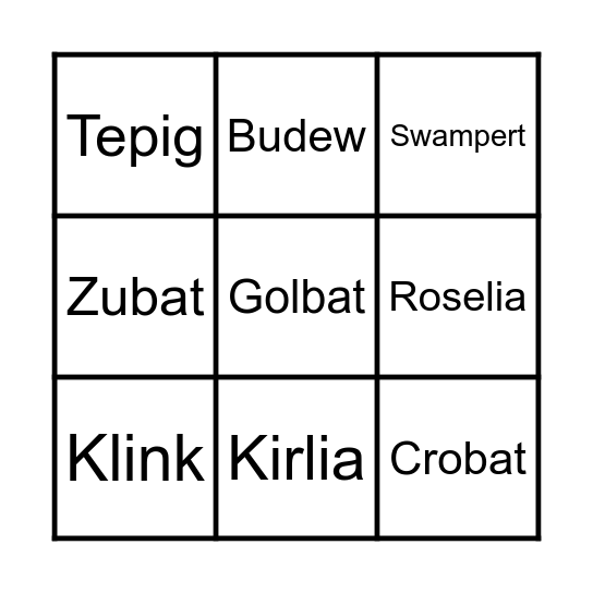 This bingo card has a free space and 8 words: Zubat, Budew, Roselia, Klink, Swampert, Tepig, Kirlia and Crobat.