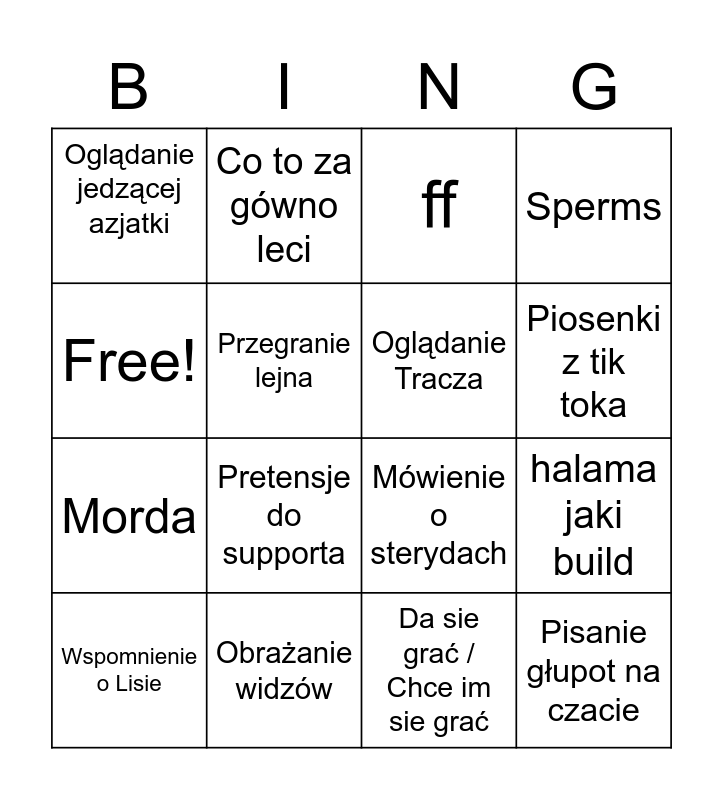 This bingo card has 16 words: Obrażanie widzów, halama jaki build, ff, Oglądanie jedzącej azjatki, Morda, Co to za gówno leci, Mówienie o sterydach, Da sie grać / Chce im sie grać, Free!, Przegranie lejna, Wspomnienie o Lisie, Sperms, Pretensje do supporta, Piosenki z tik toka, Oglądanie Tracza and Pisanie głupot na czacie.
