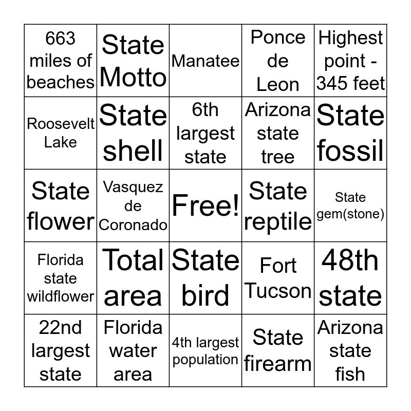 This bingo card has a free space and 24 words: Total area, Florida water area, 6th largest state, 22nd largest state, Highest point - 345 feet, 663 miles of beaches, Roosevelt Lake, State Motto, State reptile, State bird, Arizona state tree, State flower, Fort Tucson, 48th state, State shell, State firearm, State gem(stone), Manatee, State fossil, Vasquez de Coronado, Arizona state fish, Florida state wildflower, Ponce de Leon and 4th largest population.