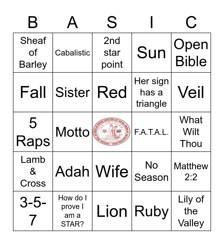 This bingo card has a free space and 24 words: Adah, How do I prove I am a STAR?, Red, 3-5-7, Open Bible, Sheaf of Barley, Fall, Cabalistic, F.A.T.A.L., Wife, Her sign has a triangle, 5 Raps, No Season, Matthew 2:2, Sister, Ruby, What Wilt Thou, 2nd star point, Veil, Motto, Lily of the Valley, Lamb & Cross, Sun and Lion.