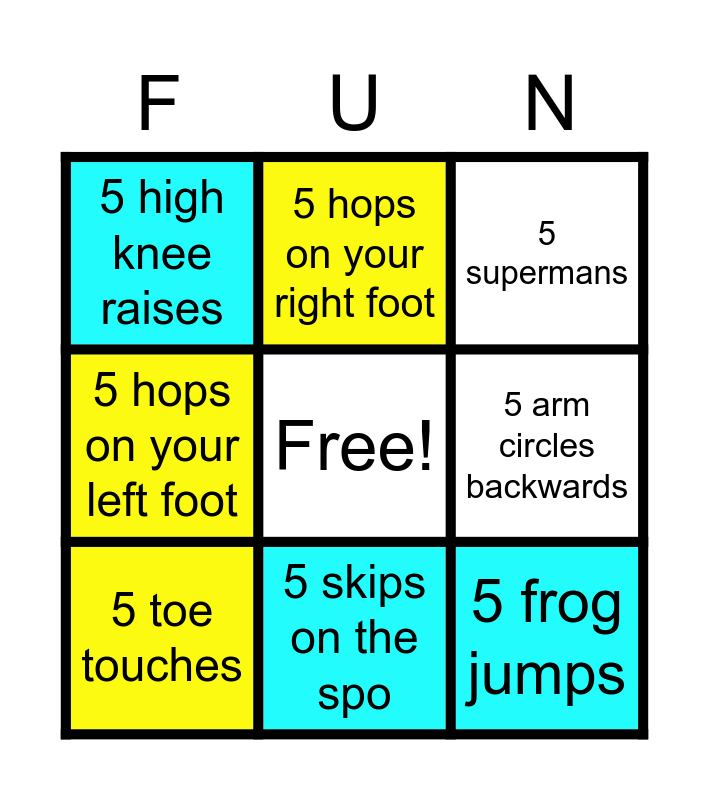 This bingo card has a free space and 14 words: 5 jumping jacks, 5 star jumps, 5 toe touches, 5 hops on your right foot, 5 hops on your left foot, 5 frog jumps, 5 rabbit hops, 5 gallops, 5 skips on the spo, 5 high knee raises, 5 arm circles forwards, 5 arm circles backwards, 5 supermans and bicycle for 5 seconds.
