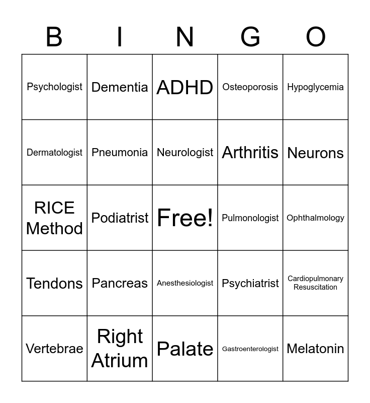 This bingo card has a free space and 44 words: Ventricles, Melatonin, Hematologist, Vertebrae, Small Intestine, Gastroenterologist, ADHD, High Blood Pressure, Hypoglycemia, Right Atrium, Osteoporosis, Pulmonologist, Anesthesiologist, Pancreas, Hemopoiesis, Palate, Pathologist, RICE Method, White Blood Cells, Neurons, Dementia, Rheumatologist, Orthopedist, Psychologist, Cardiologist, Ophthalmology, Alzheimer’s Disease, Optometrist, Psychiatrist, Tendons, Brain Stem, Cardiopulmonary Resuscitation, Liver, Pediatrician, Podiatrist, Oncologist, Cerebellum, Radiologist, Neurologist, Dermatologist, Arthritis, Common Cold, Pneumonia and Photoreceptors.