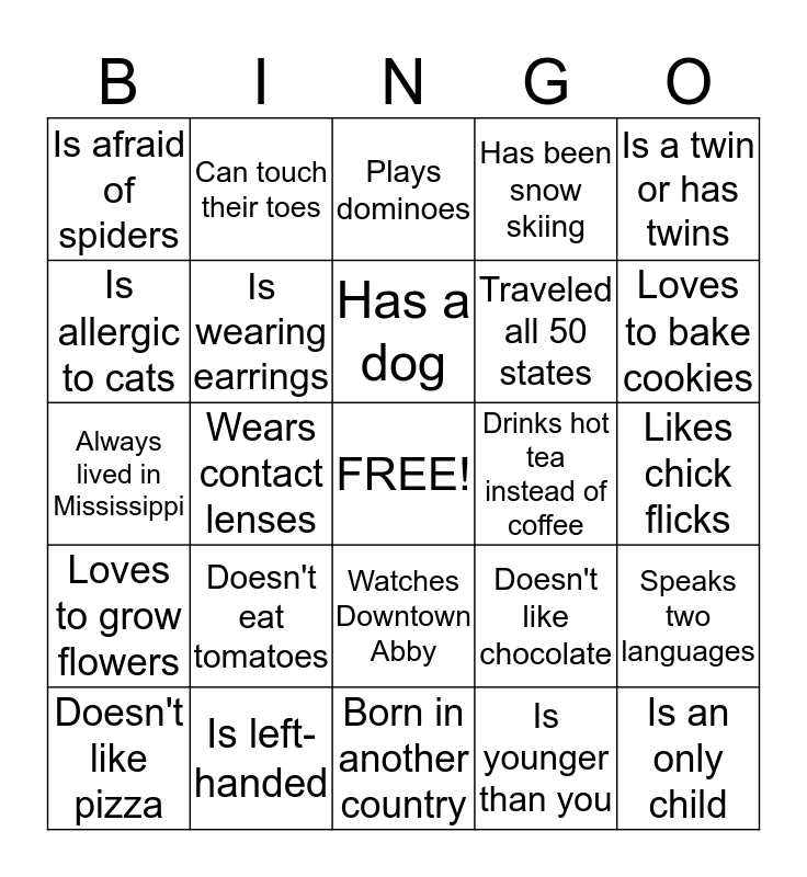 This bingo card has a free space and 24 words: Doesn't eat tomatoes, Is left-handed, Has a dog, Doesn't like pizza, Is a twin or has twins, Is afraid of spiders, Is allergic to cats, Can touch their toes, Drinks hot tea instead of coffee, Watches Downtown Abby, Traveled all 50 states, Always lived in Mississippi, Doesn't like chocolate, Speaks two languages, Is wearing earrings, Is younger than you, Likes chick flicks, Plays dominoes, Loves to bake cookies, Wears contact lenses, Is an only child, Loves to grow flowers, Has been snow skiing and Born in another country.
