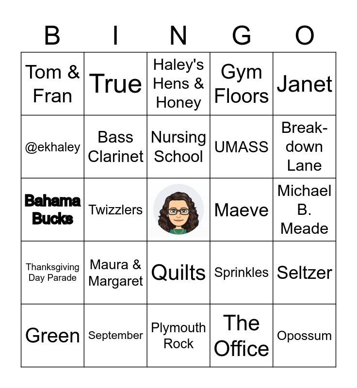 This bingo card has a free space and 29 words: Kingston, September, Haley's Hens & Honey, BYB, Janet, Tom & Fran, Bass Clarinet, Nursing School, Maeve, Seltzer, Green, Twizzlers, The Office, Opossum, Bahama Bucks, Do Small Things with Great Love, Plymouth Rock, Sprinkles, Break-down Lane, Thanksgiving Day Parade, Maura & Margaret, April 23, UMASS, Michael B. Meade, @ekhaley, True, Quilts, Gym Floors and Nurturer.