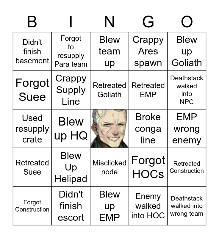 This bingo card has a free space and 24 words: Blew Up Helipad, Didn't finish escort, Retreated Goliath, Forgot Construction, Blew up Goliath, Didn't finish basement, Forgot Suee, Forgot to resupply Para team, Broke conga line, Misclicked node, Retreated EMP, Used resupply crate, Forgot HOCs, Retreated Construction, Crappy Supply Line, Enemy walked into HOC, EMP wrong enemy, Blew team up, Deathstack walked into NPC, Blew up HQ, Deathstack walked into wrong team, Retreated Suee, Crappy Ares spawn and Blew up EMP.