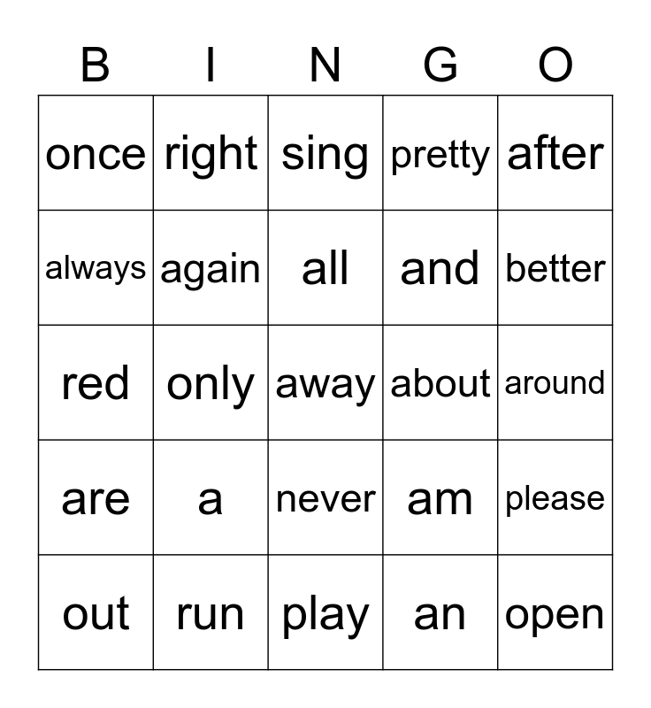 This bingo card has 25 words: a, play, all, out, after, once, always, right, about, never, and, red, am, please, again, open, around, sing, better, only, away, run, are, pretty and an.