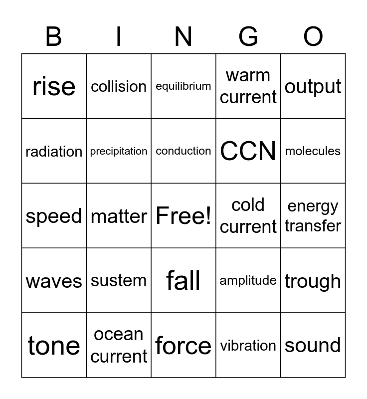 This bingo card has a free space and 45 words: tsunami, sound, pitch, tone, frequency, vibration, equilibrium, input, output, ocean current, warm current, cold current, fall, sustem, subsystem, force, elasticity, speed, breaking point, molecules, collision, clouds, weather balloon, rise, energy, energy transfer, mass, earthquake, amplitude, waves, crest, trough, air pressure, humidity, dense, matter, hail, rain, convection, conduction, radiation, CCN, thunderstorm, precipitation and wind.