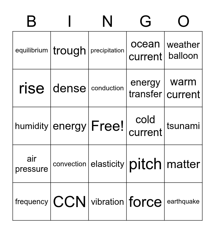 This bingo card has a free space and 45 words: molecules, earthquake, input, frequency, fall, force, precipitation, collision, weather balloon, CCN, ocean current, cold current, elasticity, convection, sustem, vibration, waves, humidity, subsystem, warm current, trough, output, speed, equilibrium, wind, tsunami, hail, crest, pitch, air pressure, breaking point, matter, amplitude, clouds, rain, energy, thunderstorm, mass, sound, conduction, rise, energy transfer, radiation, dense and tone.