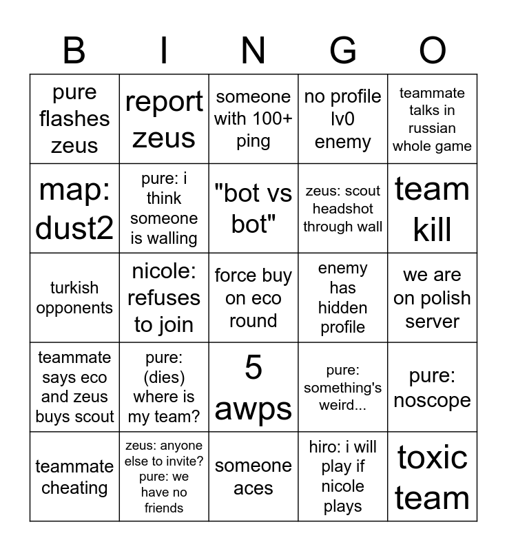 This bingo card has 25 words: teammate says eco and zeus buys scout, zeus: anyone else to invite? pure: we have no friends, force buy on eco round, hiro: i will play if nicole plays, teammate talks in russian whole game, pure flashes zeus, report zeus, someone with 100+ ping, enemy has hidden profile, pure: noscope, map: dust2, pure: i think someone is walling, someone aces, pure: something's weird..., team kill, teammate cheating, nicole: refuses to join, "bot vs bot", zeus: scout headshot through wall, we are on polish server, turkish opponents, pure: (dies) where is my team?, 5 awps, no profile lv0 enemy and toxic team.
