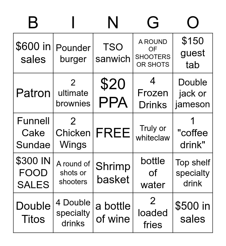 This bingo card has a free space and 24 words: A round of shots or shooters, 4 Double specialty drinks, $20 PPA, Double Titos, $150 guest tab, $600 in sales, Patron, Pounder burger, Truly or whiteclaw, Shrimp basket, 4 Frozen Drinks, Funnell Cake Sundae, bottle of water, Top shelf specialty drink, 2 ultimate brownies, 2 loaded fries, 1 "coffee drink", TSO sanwich, Double jack or jameson, 2 Chicken Wings, $500 in sales, $300 IN FOOD SALES, A ROUND OF SHOOTERS OR SHOTS and a bottle of wine.