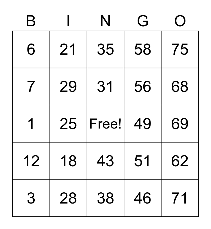 This bingo card has a free space and 24 words: 3, 18, 31, 46, 75, 6, 21, 35, 49, 69, 1, 29, 51, 62, 7, 28, 38, 58, 68, 12, 25, 43, 56 and 71.