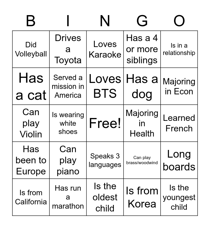 This bingo card has a free space and 34 words: Is from Japan, Is from Korea, Has been to Hong Kong, Has been to Canada, Has been to Europe, Served a mission in America, Is in a relationship, Is from California, Drives a Toyota, Built their PC, Loves BTS, Loves Karaoke, Pro at Badminton, Majoring in Math, Majoring in Health, Majoring in Econ, Has run a marathon, Can play Violin, Can play piano, Can play brass/woodwind, Speaks 3 languages, Did Track, Did Volleyball, Learned French, Is the oldest child, Is the youngest child, Has a 4 or more siblings, Speaks 5 languages, Has a dog, Has a cat, Has a non-dog/cat pet, Is wearing white shoes, Long boards and Is a cool guy.