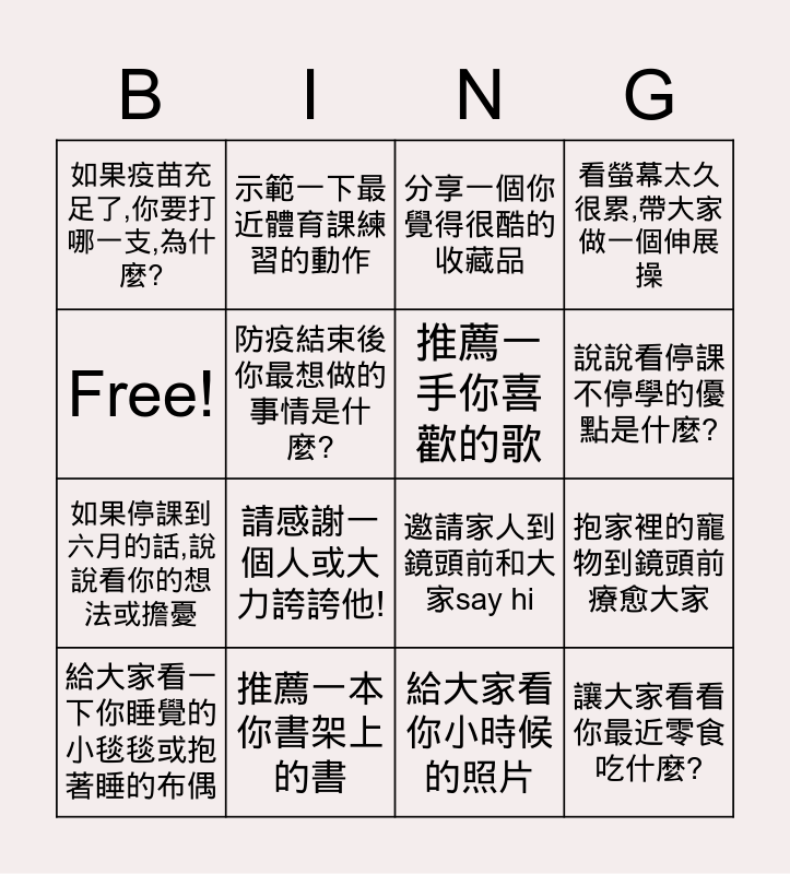 This bingo card has 16 words: 推薦一本你書架上的書, 抱家裡的寵物到鏡頭前療愈大家, 分享一個你覺得很酷的收藏品, 如果疫苗充足了,你要打哪一支,為什麼?, 如果停課到六月的話,說說看你的想法或擔憂, 示範一下最近體育課練習的動作, 邀請家人到鏡頭前和大家say hi, 給大家看你小時候的照片, Free!, 防疫結束後 你最想做的事情是什麼?, 給大家看一下你睡覺的小毯毯或抱著睡的布偶, 看螢幕太久很累,帶大家做一個伸展操, 請感謝一個人或大力誇誇他!, 說說看停課不停學的優點是什麼?, 推薦一手你喜歡的歌 and 讓大家看看你最近零食吃什麼?.