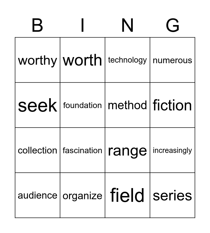 This bingo card has 16 words: organize, increasingly, technology, worthy, collection, worth, range, field, seek, foundation, audience, numerous, fascination, fiction, method and series.